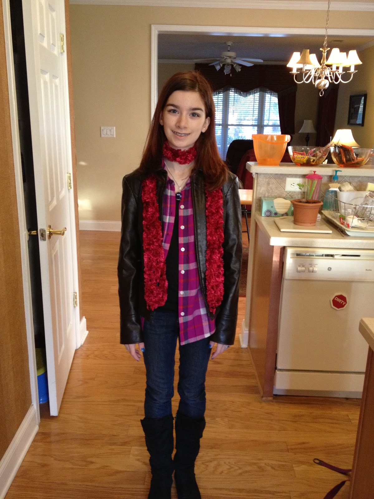 And the finished product along with Nix who decided to be Amy Ponds, the doctor's traveling companion. We found all the parts to her costume in either her closet of mine. We threw in some hash marks on her arm, but not a lot because Silence is not often found in our home. We are temporarily dying her hair red tonight to make it more official. I'm a bit nervous about how that is going to go. The perfect accent to her costume also came from the uncle as an early Christmas present. It is a TARDIS necklace that really brings the whole thing together.